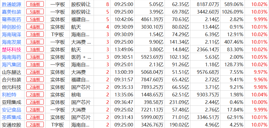 焦点股方面,福建本地股安记食品17天10板、东百集团14天7板,实控人变更的胜通能源9连板、嘉美包装6连板,商业航天概念股再升科技13天7板、神剑股份5连板,智能驾驶概念股浙江世宝7天5板。