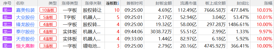焦点股方面,实控人变更的嘉美包装10连板、锋龙股份5连板,机器人概念股大业股份5连板、天奇股份4连板、泰尔股份4连板。