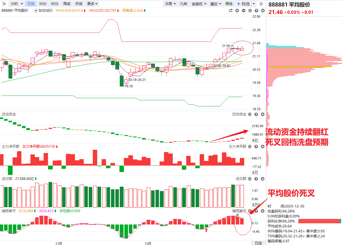 指数角度,平均股价开始分化,捕捞季节出现死叉信号,预计会延续死叉回调波段,不过流动资金持续翻红,资金强势背景下调整更多是洗盘预期。不排除年底最后一天在有形之手的干预下大盘继续上攻4000点“完美”收官,但最多也是把原有的分化节奏延后。