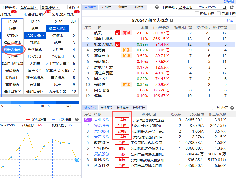 机器人方向,日内十几家涨停强势发酵,不过目前来看更偏向大号的日内量化轮动套利,26号的几个连板已经全部连续两个交易日晋级,太过一致正常明天会有内部分化,除非第二天有中军的明确表态(有大票能像12月26日的航天发展大高开秒板)。