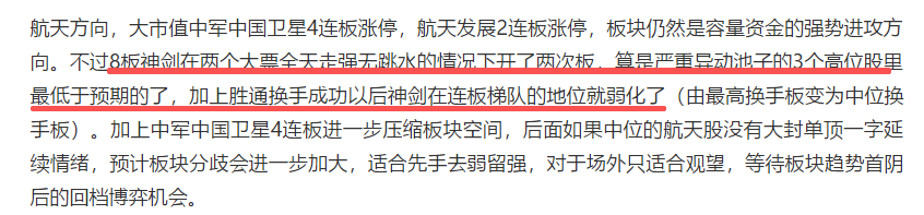 航天方向,昨晚的策略也提过连板先锋强度低于预期,今天果然也兑现按了跌停,板块整体冲高回落不过还保留了不少活口。后面主要看市场整体情绪,如果市场出现3连跌停的个股,板块的分歧就可能进一步加大,或仅给个弱修复脉冲午后再度反杀;如果市场整体情绪回暖,跌停个股集体放量(或起码跌停封单大幅减少),且涨停封单增加(今天竞价最大涨停封单为锋龙股份的44亿),中位梯队出现比较强势的大单一字,那航天作为本轮行情的主流热点,正常也应有相应强度的回流修复。