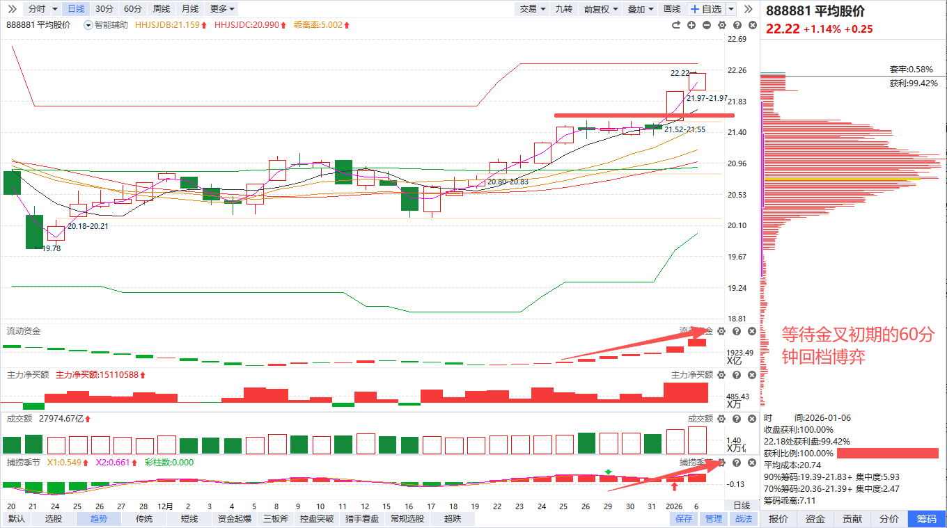 指数角度,上证13连阳,平均股价延续金叉上行,流动资金持续翻红,市场量能持续放大,整体维持良性上涨趋势,捕捞季节日线金叉初期可以积极关注60分钟回档节点的热点题材、人气股博弈。