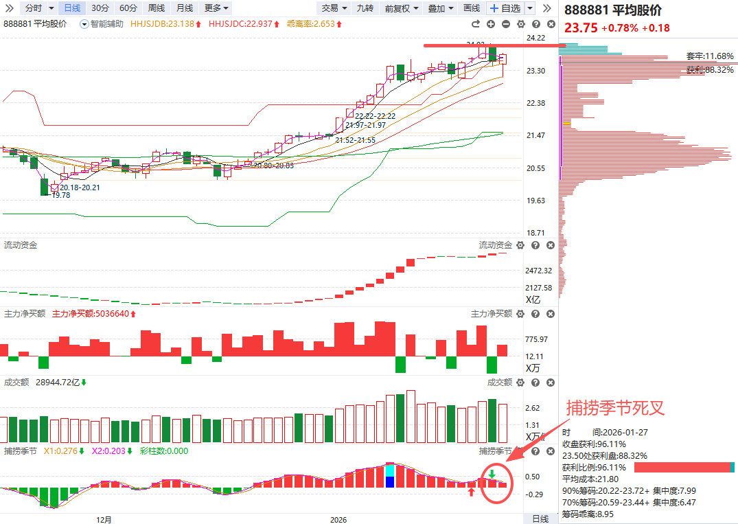 指数角度,平均股价出现探底回升大长腿,指数和部分权重板块修复,但捕捞季节仍然处在死叉初期,短线反抽过后,如果没有增量资金入场承接,预计指数仍会维持弱势震荡结构。