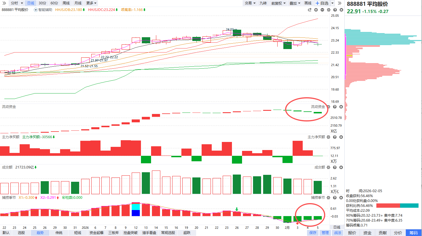 指数角度,流动资金持续翻绿,市场量能大幅缩减,平均股价也来到了金叉反弹的第3个交易日,如果量能进一步缩减且盘面亏钱效应加大,出现连续跌停个股,就有捕捞季节死叉的风险。某队早上拉白酒、下午拉证券的护盘动作也基本没资金认,本来就缺钱还硬拉权重结果只能是越护越差。