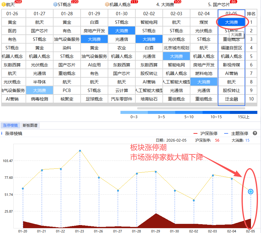 日内发酵的大消费,板块涨停潮市场的涨停家数反而大幅下降,本质上和前面的黄金一样,属于逆情绪的品种,基本不在考虑范围,如果真的走出中阳突破,就说明市场情绪整体非常差了,那就观望休息等待分歧释放就好。
