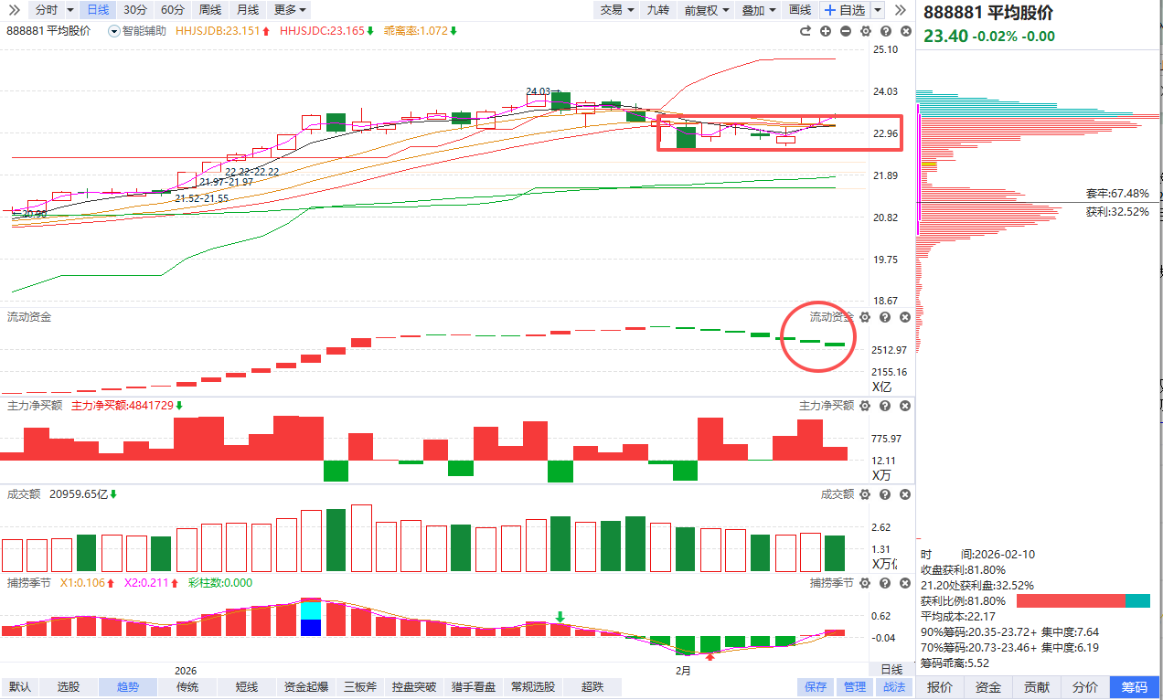 指数角度,平均股价重新站上辅助线,不过流动资金连续翻绿,且捕捞季节已经金叉反弹多个交易日,短线滞涨后如果没有增量资金进场,容易出现死叉震荡分化,需要注意回避冲高盲目追涨,耐心等待资金拐点或更具性价比的回档节点出现。