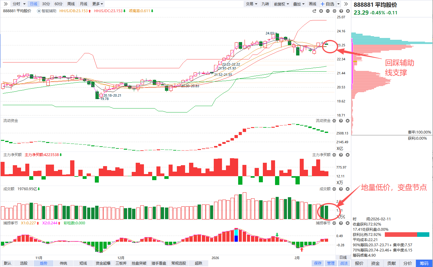 指数角度,平均股价缩量回踩,市场量能跌破2万亿,不过地量低价后面预期反而不悲观,极致的缩量以后市场的情绪想要扭转过来是非常迅速的,短期还是维持震荡预期,后续第一个回档金叉如果流动资金翻红,可以积极看新一轮趋势主升。