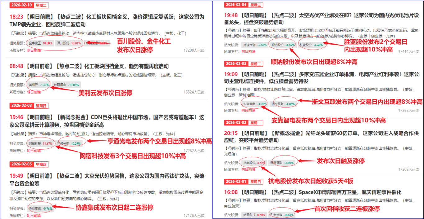 栏目的亮眼表现远不止于此,在2月节前效应凸显、题材轮动节奏大幅加快的背景下,《明日前瞻》栏目仍然凭借专业的研究和敏锐的嗅觉,精准捕捉题材切换节奏: