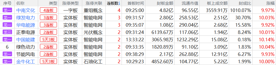 焦点股方面,电力、电网方向的汉缆股份15天8板、金开新能10天5板、中南文化4连板,光纤概念股法尔胜14天7板,化工股金牛化工9天5板。