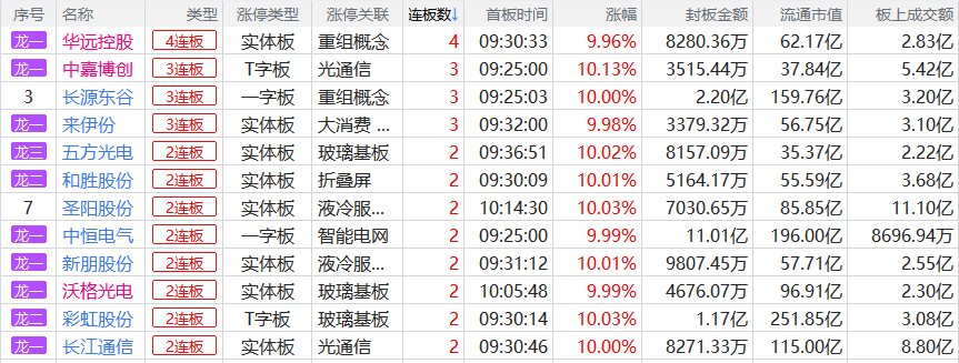 焦点股方面,并购重组的华远控股4连板、长源东谷3连板,算力板块中嘉博创3连板,股权转让的来伊份3连板。