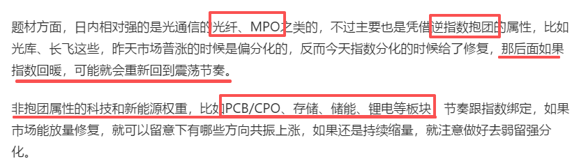 逆指数抱团的方向里,主要就是光纤和医药相互竞争了,周五创业板指受利好刺激大涨,这两个方向就都偏向震荡分化了,后面如果指数分歧,可以看下有没有资金回流。不过这两个里面,光纤是纯独立炒作,既逆指数也逆情绪,如果回流光纤的话一般意味着日内指数和情绪双杀(类似周四长飞光纤涨停,指数和个股普跌),就要注意做好仓位和风险管理。
