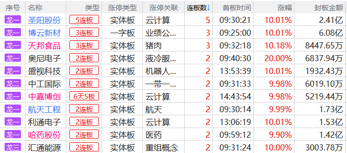 焦点股方面,储能板块圣阳股份11天6板,算力租赁概念股中嘉博创6天5板,并购重组的长源东谷6天5板,基建股中工国际9天5板。