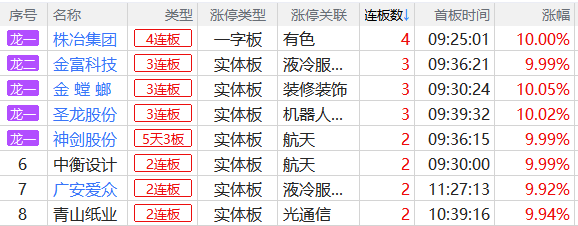 焦点股方面,业绩超预期的株冶集团4连板,服务器液冷概念股金富科技3连板,商业航天概念股金螳螂3连板,机器人概念股圣龙股份3连板。液冷人气股英维克因业绩不及预期,日内一字跌停导致板块整体下挫。