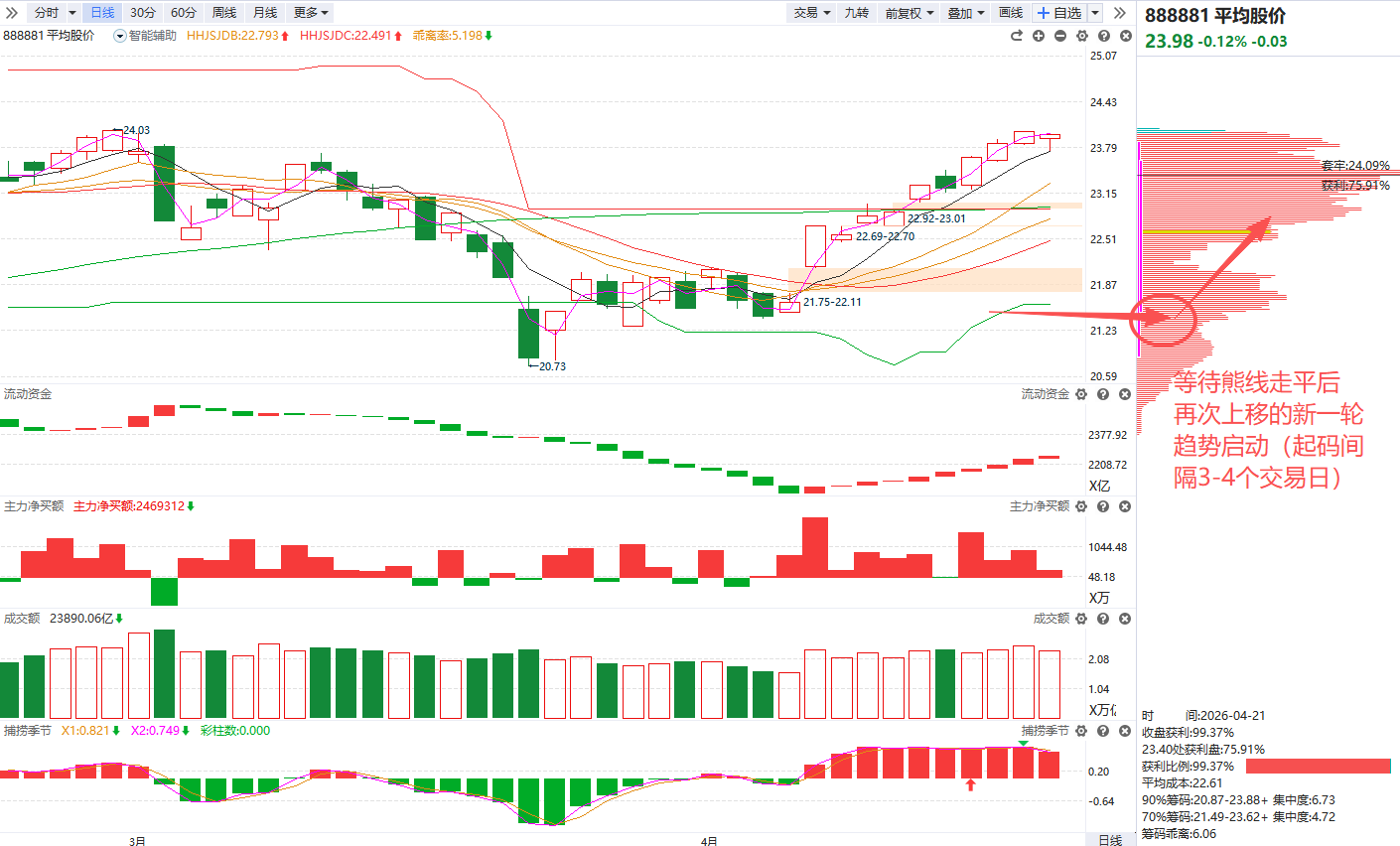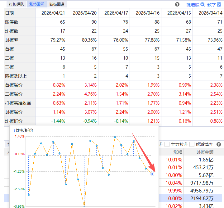 短线方面,倒是已经提前释放过一轮分歧,从4月13日以来基本都处在分化节奏里,最近炸板折价更是连续3个交易日为负,意味着炸板个股未被修复,亏钱效应充分释放。那么在经过一轮连续分化以后,高度板重新掉到3-4板,短线接力的博弈开始进入有性价比的阶段。目前的高度板株冶集团是炒作有色金属+一季报业绩,之前连最强的题材液冷板块的连板高标圣阳,都被业绩线的博云卡掉了,说明4月底业绩还是重要的加分项,那么作为现有连板梯队里为数不多有业绩的,如果高度板能主动换手并且给到竞价量强度,可能会带动连板情绪走一个过渡的小回升周期,同时也可以留意熊线刚刚开始上移的有色板块有无低位补涨。