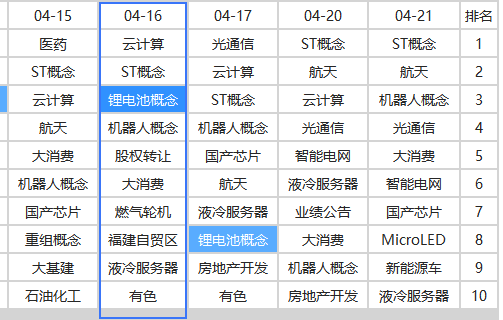 如果高度板株冶集团继续惯性顶一字没主动换手,就说明资金风险偏好仍然较低,高度板连续加速后可以留意同梯队(4月16日首板)的回档,有无涨停复制的回档博弈机会。从涨停棱镜来看,4月16日的活跃题材主要有云计算和锂电池。云计算方向由于高度板圣阳跌停,短线回档弹性可能受影响。锂电方向,前面宁德披露业绩同比大增,今天天齐锂业披露一季度预报也同比大增,行业整体的基本面预期比较好,在4月窗口回档反弹的概率就更大一些。