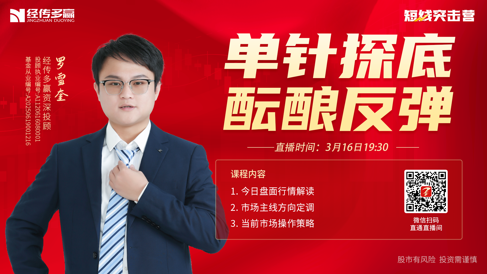 张明科 职业编号:A1120619100001, 张明科,从事金融研究、证券分析多年,对主力操盘行为有很强的认知,熟悉中小投资者的操作和心理特点,擅长用资金推动论和波段理论把握短线、中线个股。 市场见解:顺应趋势,把握资金流向,才能较为轻松在大势中获利。