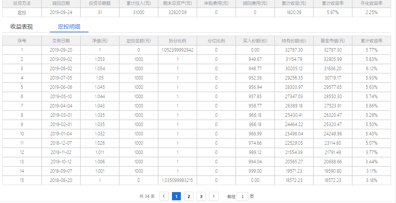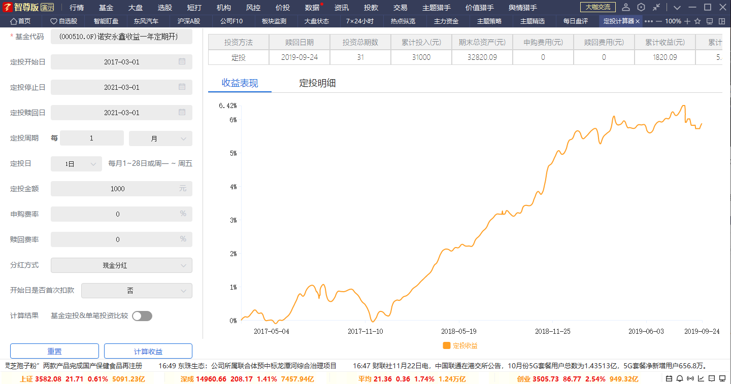 根据用户设定的定投参数计算得出基金定投的收益情况,主要包括目标基金的赎回日期,投资期数,总投入,总收益和总收益率等评价指标,同时给出定投收益曲线和定投明细。