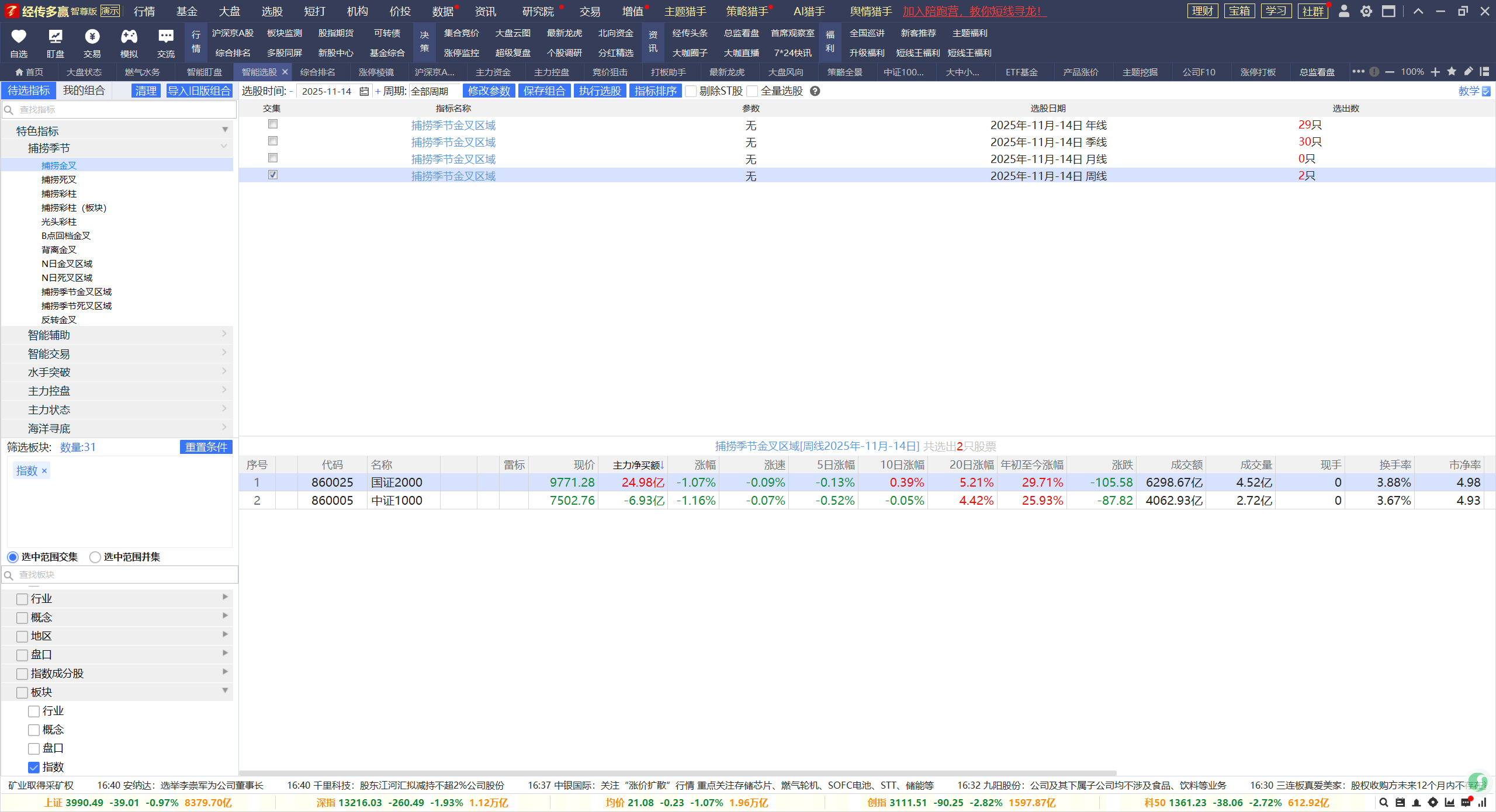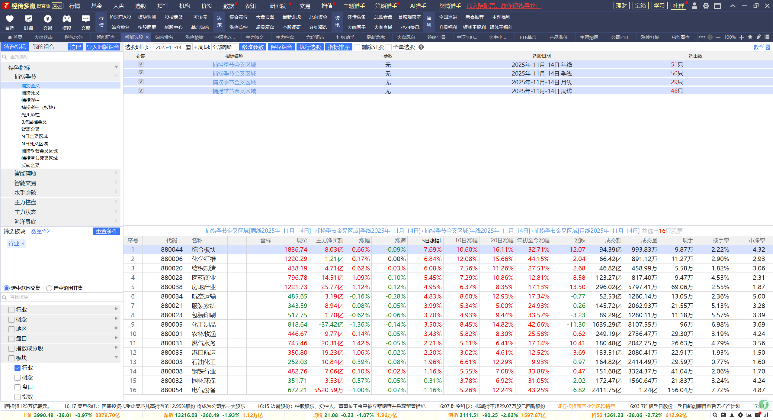1,目前,年、季、月、周捕捞季节金叉区域交集的板块是16个。代表的是长线,中线,中短线,短线都处于金叉区域的板块,这些筛选不是说未来涨幅会更大,本质是都处于金叉区域,那马上死叉的概率较小,比较难出现套在长线,中线,中短线的高点,核心是从安全角度来考虑避免出现未来趋势的风险。