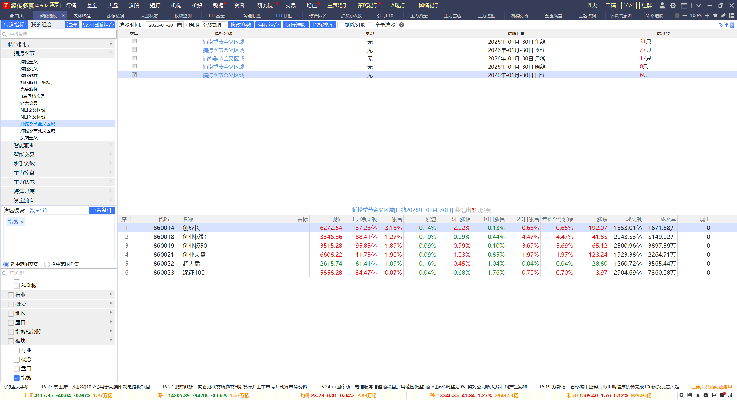 4,短线角度,周五创业板快速反弹,带动上证指数收复4100,是不是CPO,算力等方向又可以继续延续,这个观点等待验证,因为有行情不是一天,一天的行情错过也没关系。目前没有周线金叉的指数,也就是更多都是日线反弹几天,日线金叉反弹+指数中短线上攻向上,就有可能带动指数周线金叉,也就是年前布局跨年行情的时机的信号。