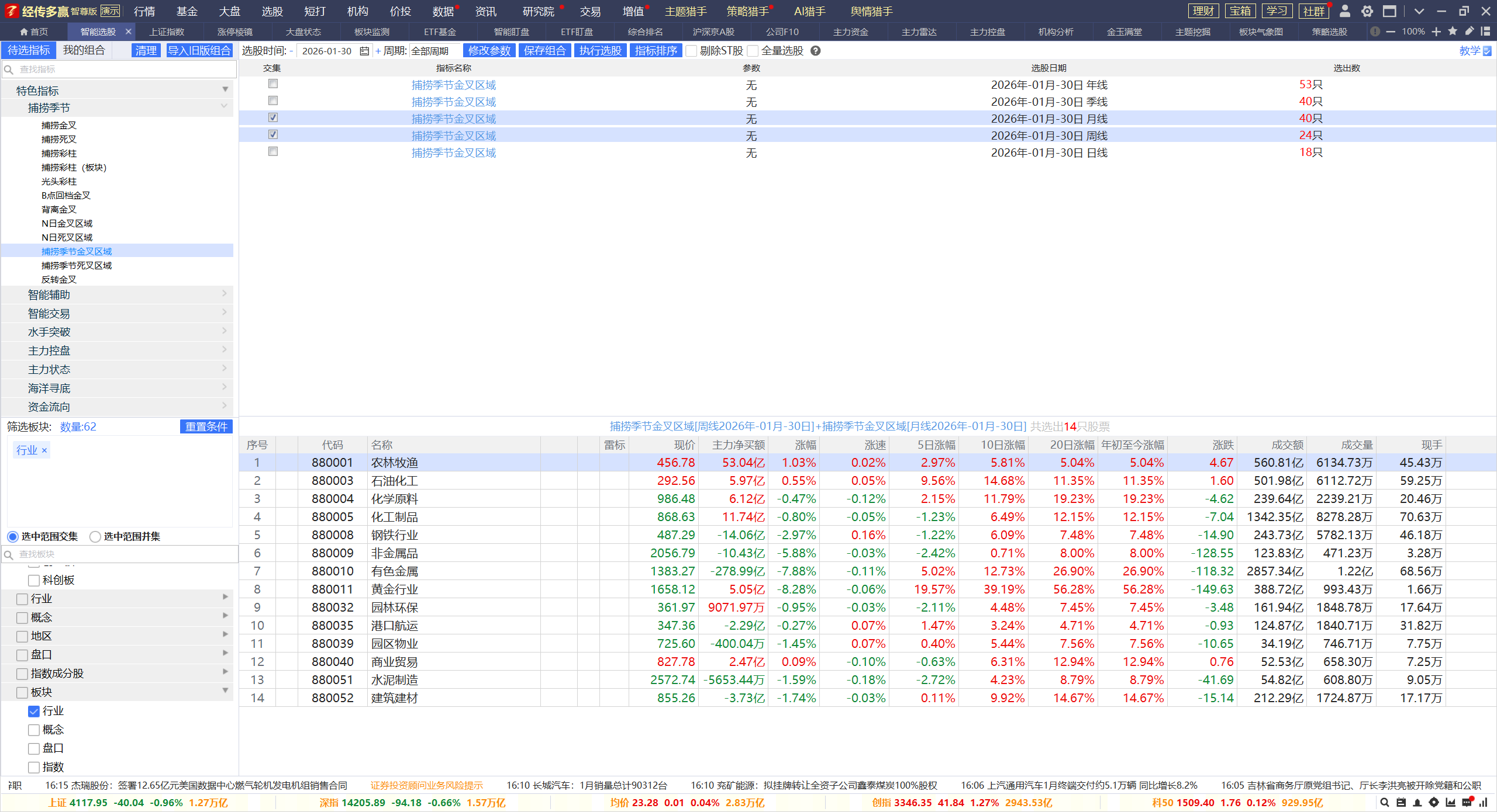 1,月线金叉区域+首先金叉区域,基本上都是传统行业为主,其中有最近火热的有色,也有长时间没有炒作的数你,钢铁,农业等等的。趋势角度来看,传统行业的炒作,也需要符合宏观,政策,产业,事件的四个维度,以上板块中,有色,黄金,三化,石化,非金满足这些条件,传统行业的反复,更多是有部分观点认为涨价的炒作周期,最后一步是农产品,这个观点依然有待验证。