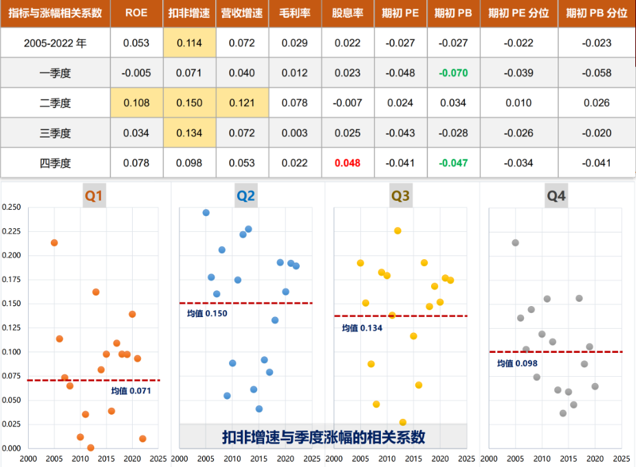 从数据图中展示的结果:季度最为有效的财务指标是扣非增速,意味着扣非增速越高则季度景气度越高,增速模型更为有效;扣非增速和季度涨幅正相关,其中二季度和三季度对财务指标敏感最高,一季度则是敏感度最低。