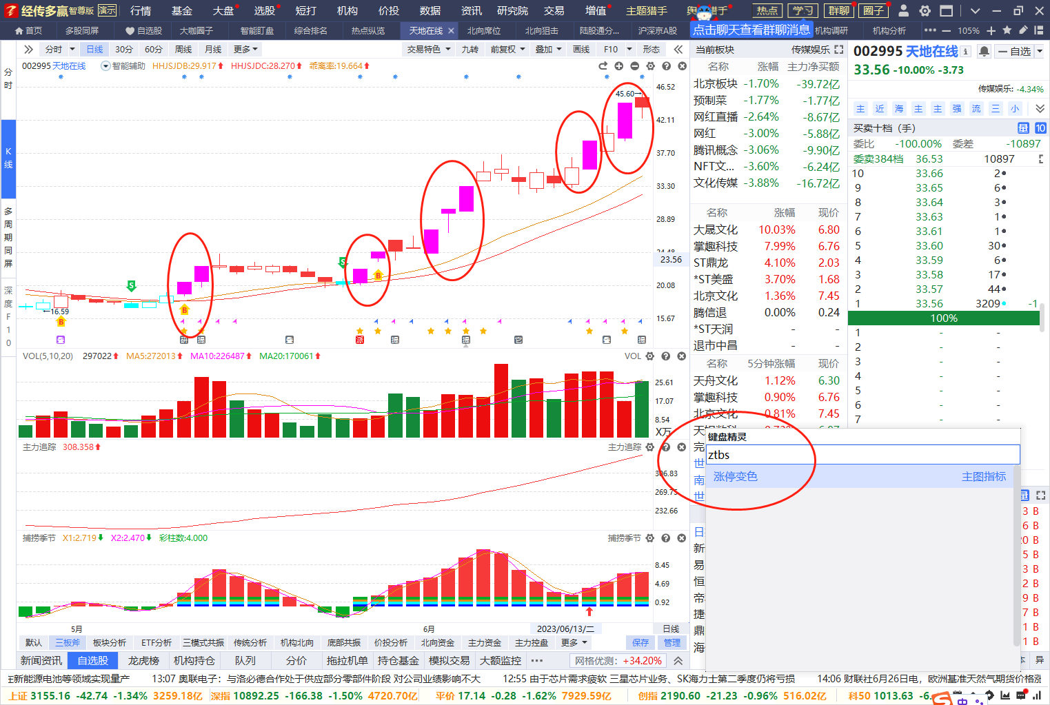 大家应该非常清楚,喜欢涨停不仅仅是因为股价上涨10个点,甚至20个点,更是因为市场在股价中最强的表现就是涨停,涨停能代表情绪,涨停能代表人气,代表资金的活跃度,代表市场的赚钱效应。在软件当中输入【ZTBS】涨停变色指标,可以帮助我们更容易发现涨停股,选好涨停股。