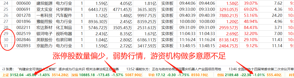 另外,当复盘时也可以统计一下当天涨停股的情况,当市场全部涨停股在30家以下,一般是处于冰点行情,涨停股偏少,资金做多意愿不足,那么代表市场的赚钱效应就一般,注意行情冰点下,要等待机会再下手。当出现50-100家的范围,一般属于活跃健康的市场,积极操作,也是大家说的经常能在好的行情,抓住机会抓住涨停股,其实和数学概率一样,在涨停扎堆的环境下,做一只涨停股不难,是不是在做高胜率的事情。当市场处于百股涨停千股涨停,一般市场处于情绪高潮,高潮过后必有分化,市场大部分资金获利盘会非常多,随时注意高位风险,不延续涨停新高,及时控制利润回撤。