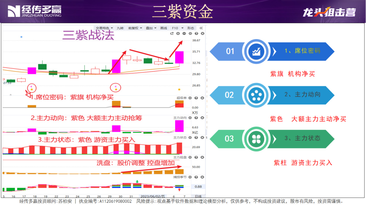 涨停三紫战法,也是平时做龙头股的首选战法,抓住主升浪机会,认识龙头特征,低位涨停板启动,形成三紫资金。