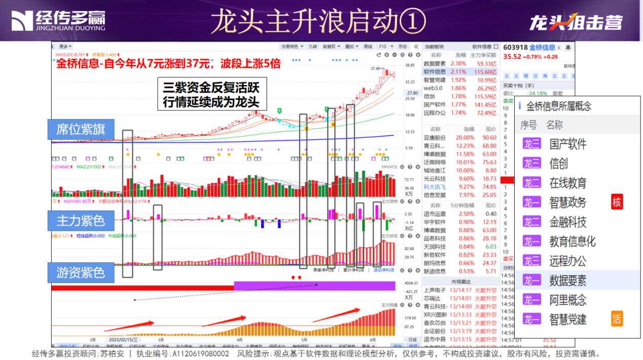 金桥信息,今年从7元涨到37元,主升浪一波接一波,上涨5倍,毫无疑问是市场的龙头标的,我们也来发现一下三紫战法的用法巧妙之处,如何抓涨停强势股,做主升浪的胜率提升。今年2月16日首次出现低位涨停突破,同时具备,一紫资金(机构席位紫旗)、二紫资金(主力动向紫柱)、三紫资金(主力状态游资紫色),个股主力控盘阶段开始走上升趋势,后续股价在波段上涨容易找到低吸买点。在今年5月份调整后再度涨停突破,三紫再次形成,股价波段趋势再创新高。三紫资金强势,机构游资主力合力做多,热点板块强势,个股容易走出主升浪机会。