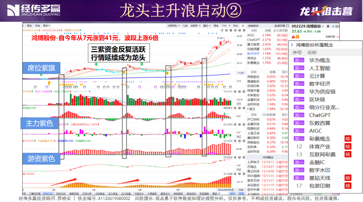 鸿博股份,今年从7元涨到41元,主升浪一波接一波,上涨6倍,我们也来发现一下三紫战法的用法巧妙之处,如何抓涨停强势股,做主升浪的胜率提升。今年股价在2月初重新底部涨停突破,形成三紫资金,机构游资席位活跃出现,资金力度非常强,加上主力控盘向上,游资紫色,主力动向紫色抢筹,形成上升趋势,龙头启动的每一轮起爆点都离不开资金大幅买入,离不开三紫资金的信号形成。