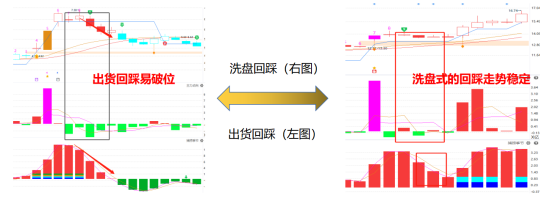 判断回踩是洗盘还是出货,主力资金有着本质的区别,对比如下所示