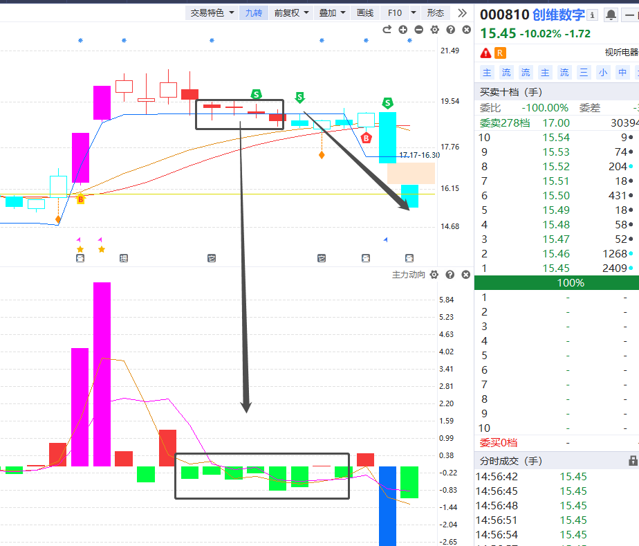 以创维数字为例,前面两个板时,是标准的三紫强势股特征,看不出任何不好的信号。但是死叉回踩几天过后,很明显开始出现连续流出的出货式回踩,这个时候如果还去低吸,很容易破位大跌。做涨停复制,做回档,一定要避免低吸连续流出的个股。