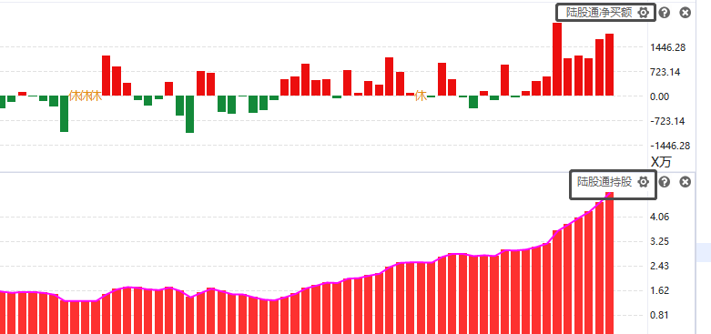 如图所示,陆股通持股代表外资持股占总股本的比例,这个数值越大,代表外资在这只股里面的持股比例越大。
