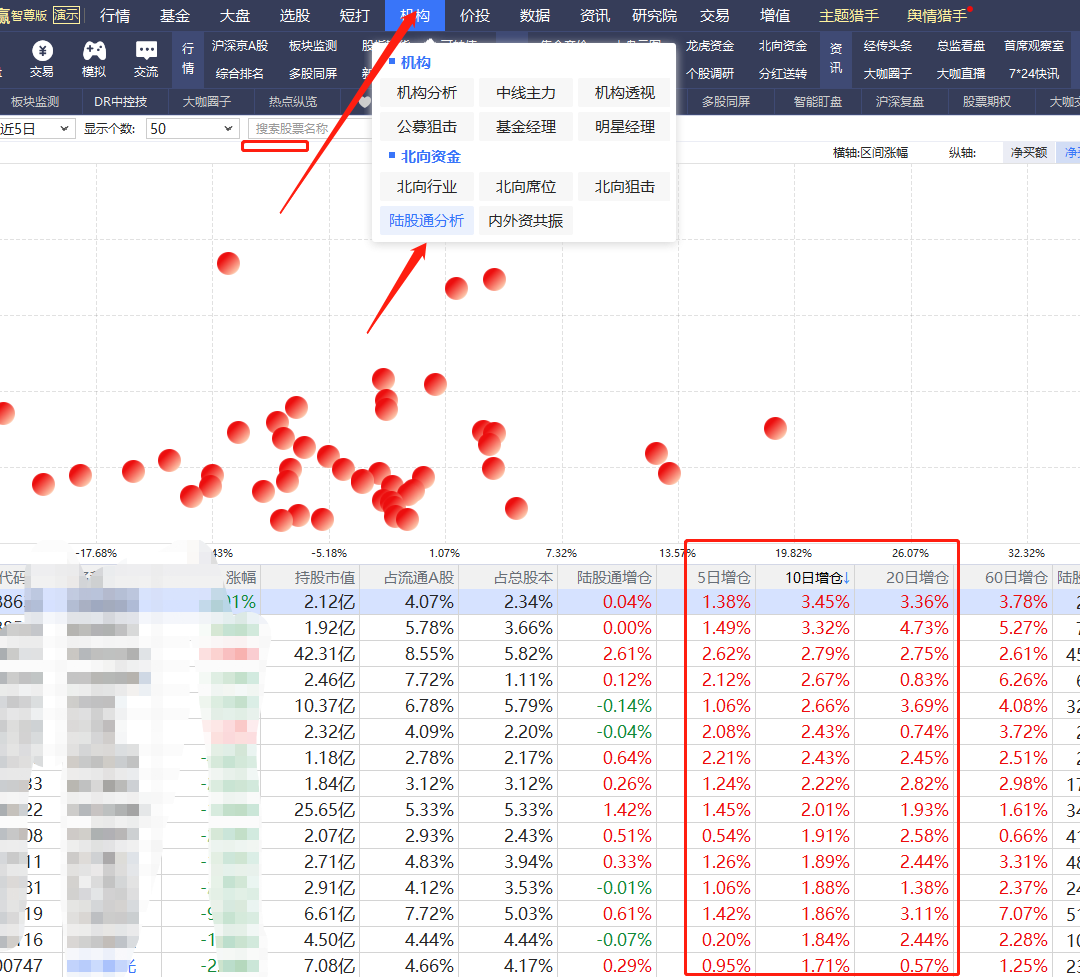 如图所示,打开机构,陆股通分析,通过陆股通增仓5/10/20日增仓排序,就可以快速找到近期外资在底部连续加仓的个股了。