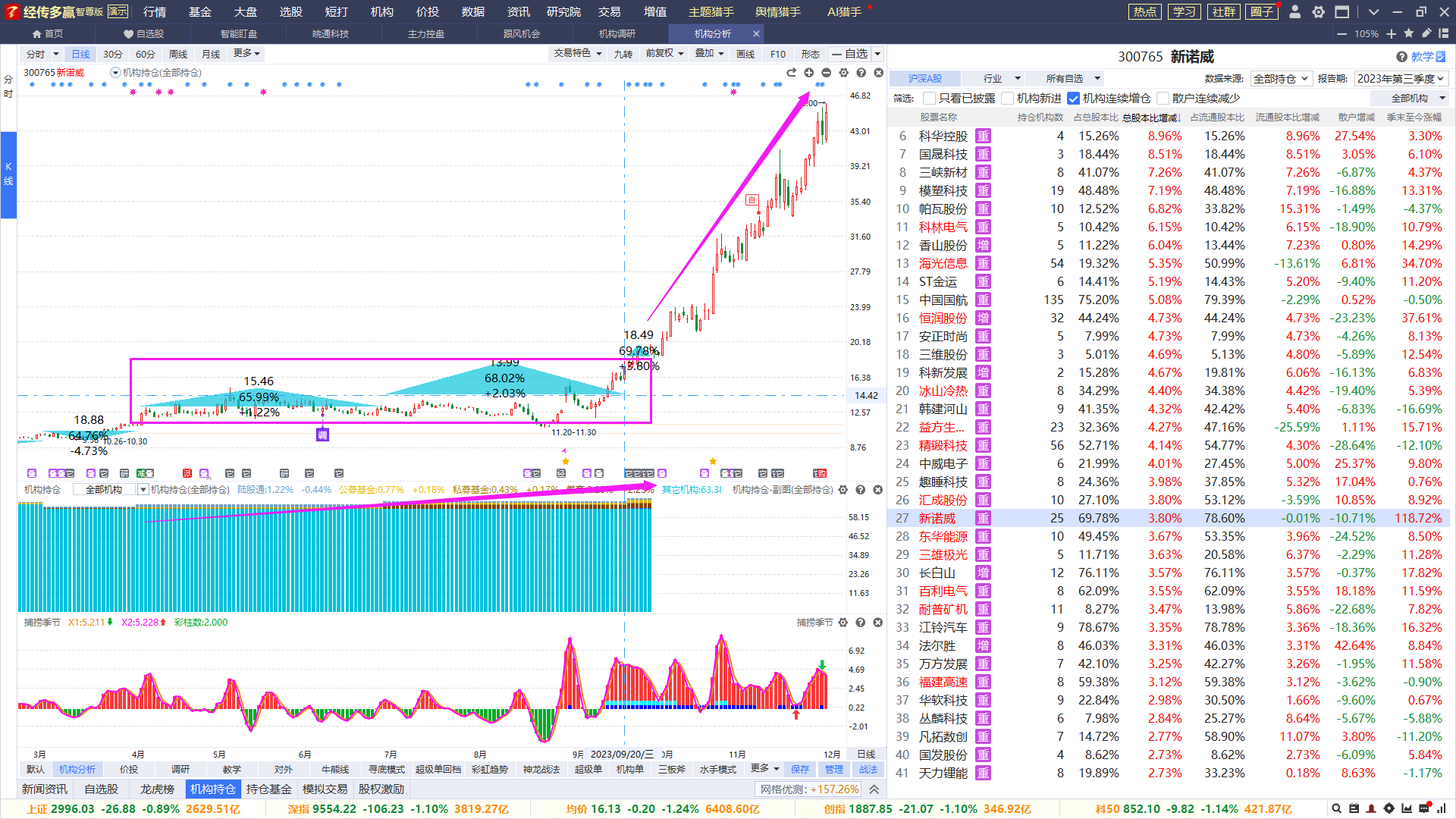 如新诺威,2023年2~3季度机构整体连续增仓,但股价期间为弱势震荡,在第4季度有较为强力的反弹爆发。