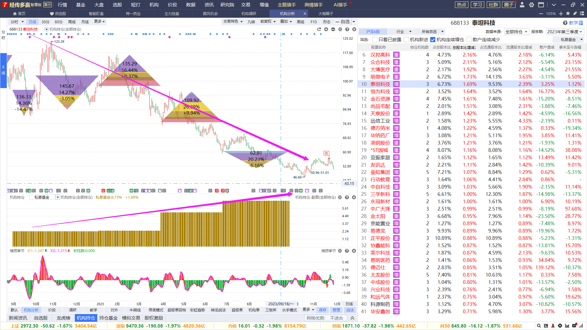 在中自科技2023年2~3季度的运行可以看到,私募连续增仓期间股价以震荡为主,3季度末出现机构调研活动,股价步向企稳,最后带出较强力的中线拉升,机构调研的信号甚为重要。