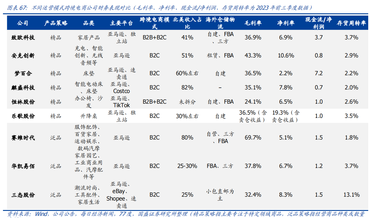 ➢ 泛品+第三方:包括赛维时代、华凯易佰、三态股份等,毛利率较高、净利率较低、期间费用率较高,考验拿货、本土化运营、库存管理等能力。