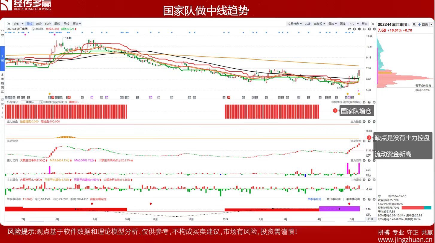 如上图所示,滨江集团是在五月初的时候,在我机构分析课程中教学的案例之一,当时利用国家队持仓数据,流动资金,主力动向+主力增仓和滚动净利润指标教学大家选出来。 由于一季度国家队增仓完之后,股价并没有出现大涨,而是继续做平台中震荡,并没有提前透支涨幅,所以符合我们的选股条件。