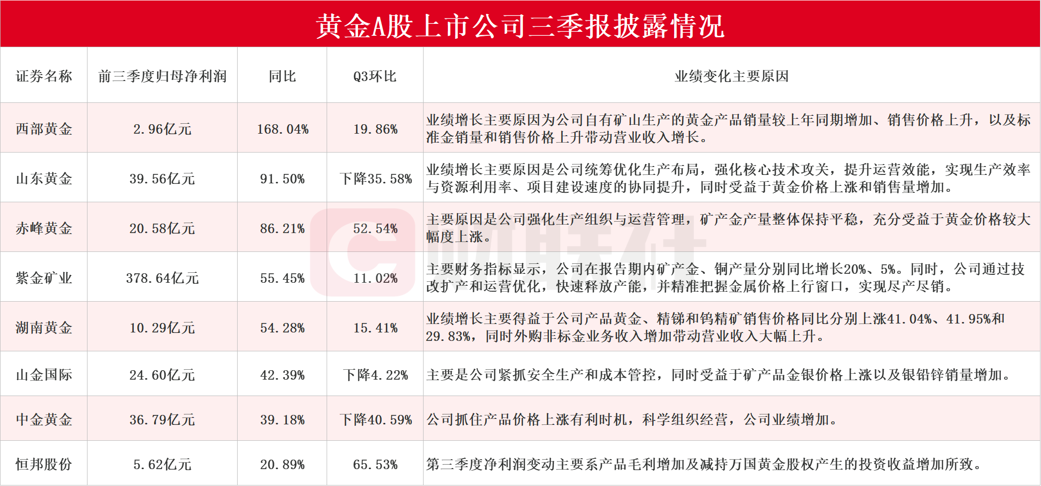 财联社10月30日电,据Choice数据统计,包括西部黄金、山东黄金、赤峰黄金、紫金矿业、湖南黄金、山金国际、中金黄金和恒邦股份在内的8家黄金上市公司披露三季报。其中,西部黄金前三季度净利润同比增长168%,山东黄金前三季度净利润同比增长92%,赤峰黄金、紫金矿业和湖南黄金前三季度净利润同比增长均超50%。环比表现方面,恒邦股份Q3净利环比增长65.53%,赤峰黄金Q3净利环比增长52.54%。