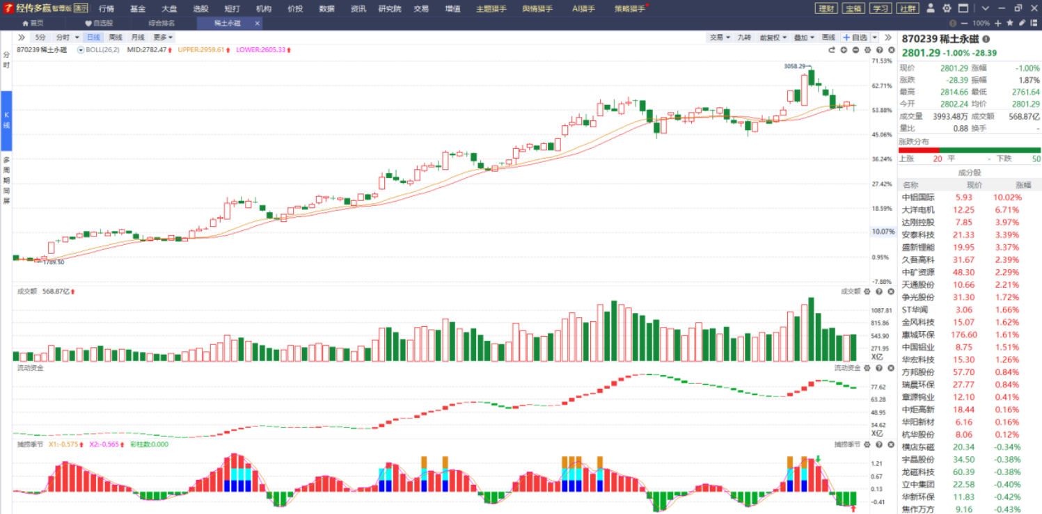 稀土后续的反弹跟资源战略、供需格局持续偏紧有密切的关系,该板块目前正处于回踩智能辅助线的关键时刻,只是成交量还未恢复过来以及流动资金还持续保持翻绿状态,不过捕捞季节倒是收出金叉积极信号,后续看它能否在大环境不好的背景下保持一定韧性在辅助线上方企稳,如果能企稳的话则等待更多好转信号的出现,倒是一个不错的介入时机。