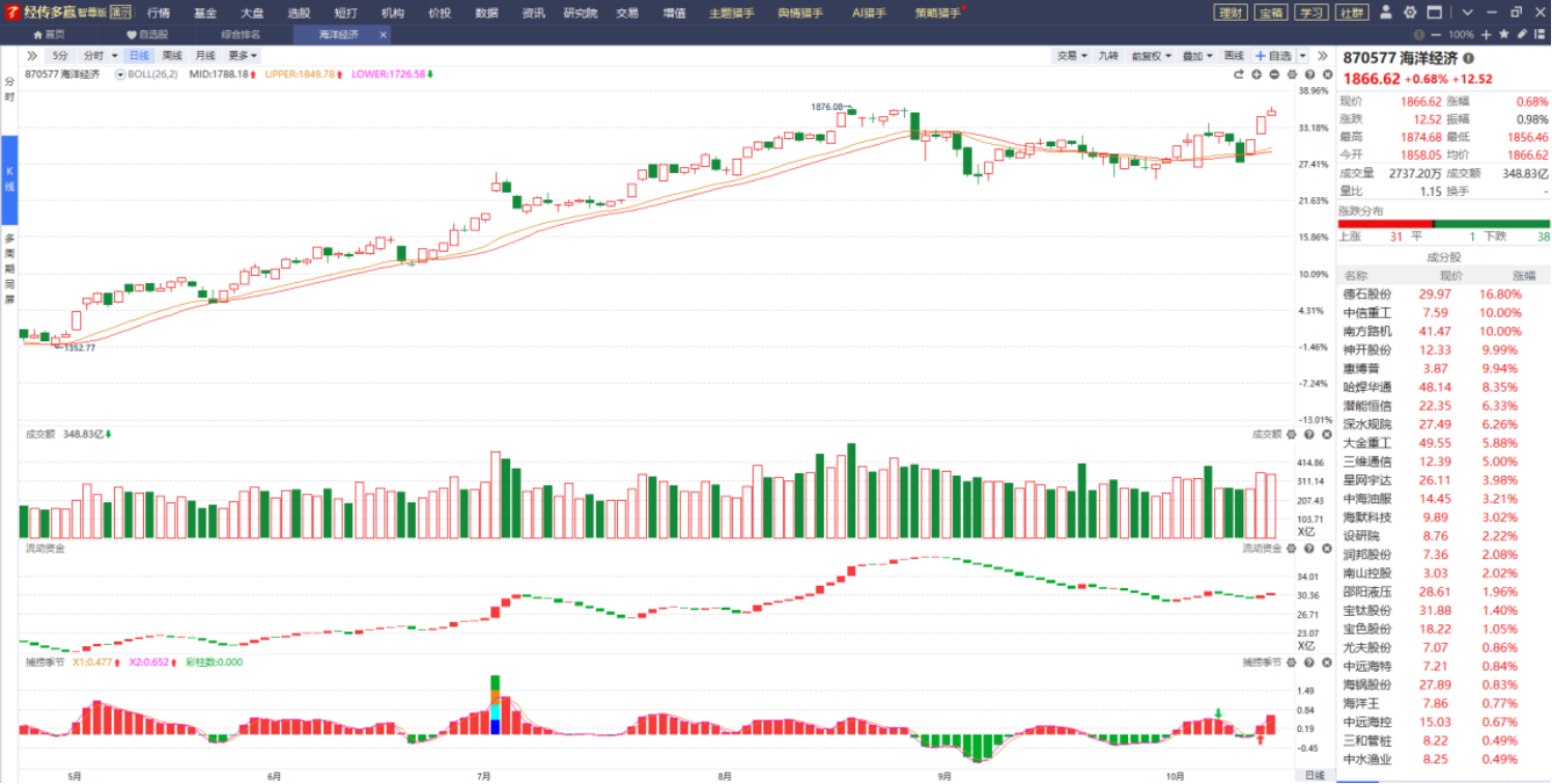 海洋经济经过连续三天的上涨上升趋势已经逐步确定,成交量呈放量状态,流动资金连续两天翻红,捕捞季节收出金叉,趋势跟指标是没有问题的,而且又叠加“十五五”政策的展望,有望刺激该板块继续上涨,可持续跟进。