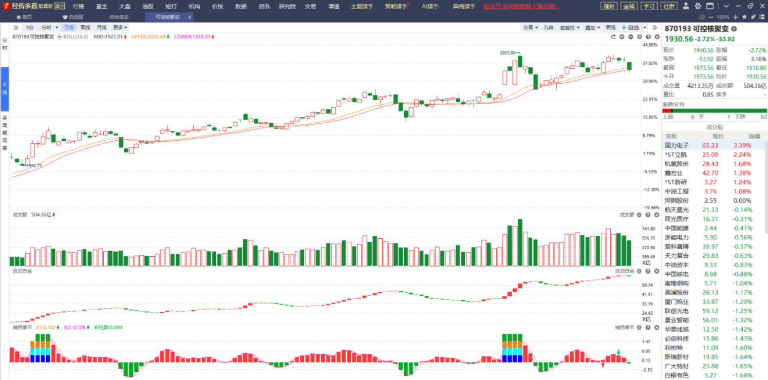可控核聚变由原本的横盘窄幅震荡逐渐转变为下跌行情,而且从各个指标来看都有走坏的迹象,成交量呈持续缩量状态,流动资金翻绿,捕捞季节已经死叉多天,后续关注它能否在智能辅助线上方企稳,一旦跌破则无须过多关注。