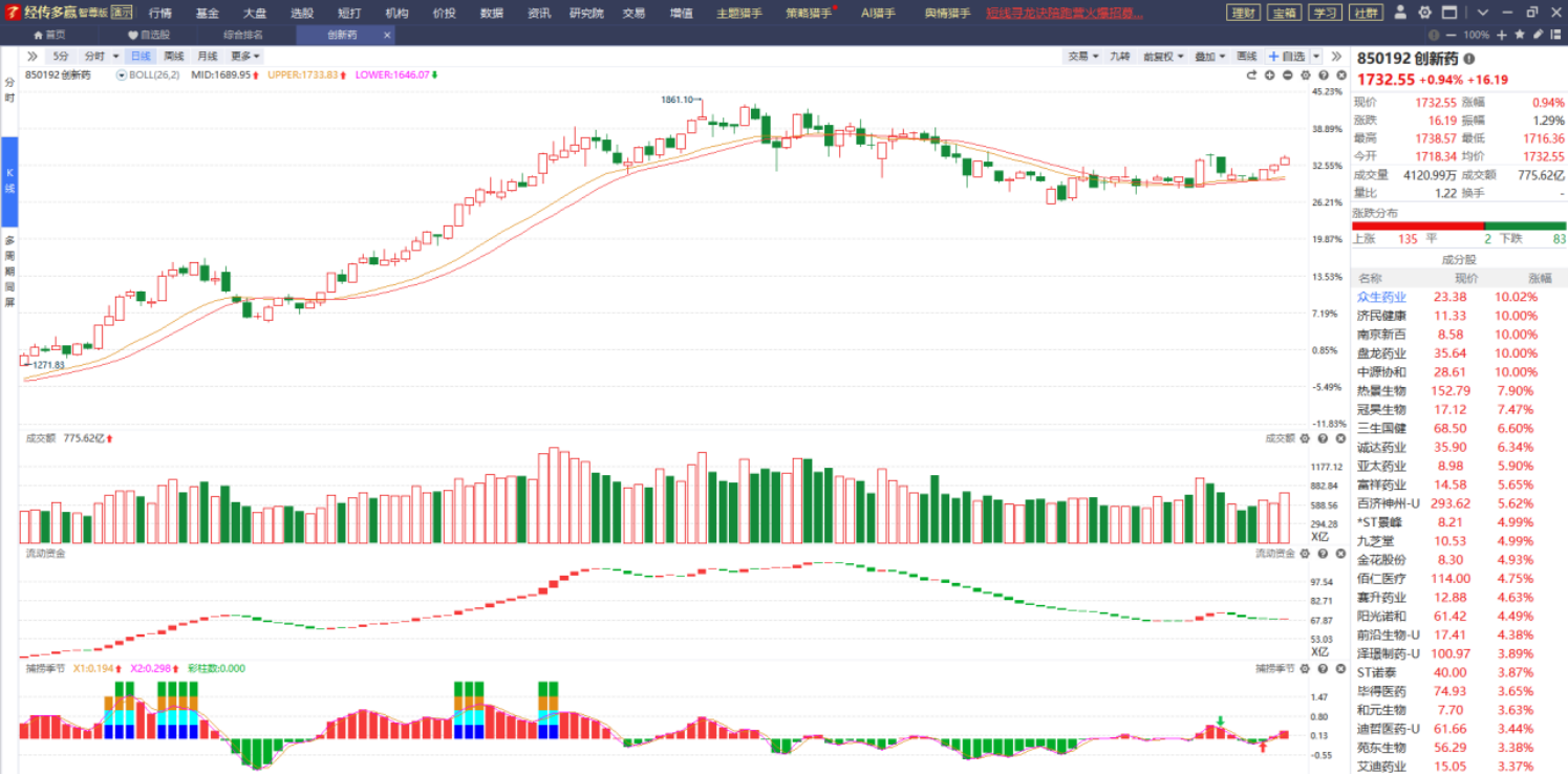 自从酿酒板块从底部止跌反弹以来,市场逐渐迎来“喝酒+吃药”行情,而且医药的趋势还保持得不错,指标方面也不错,流动资金第一天翻红,捕捞季节收出金叉,况且它所处的位置也不算高,倒是一个非常值得布局的方向。