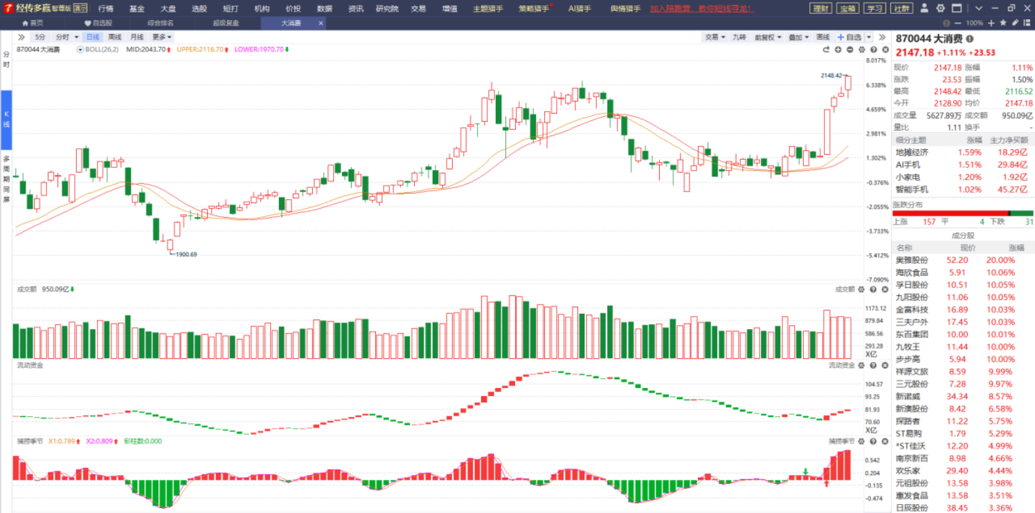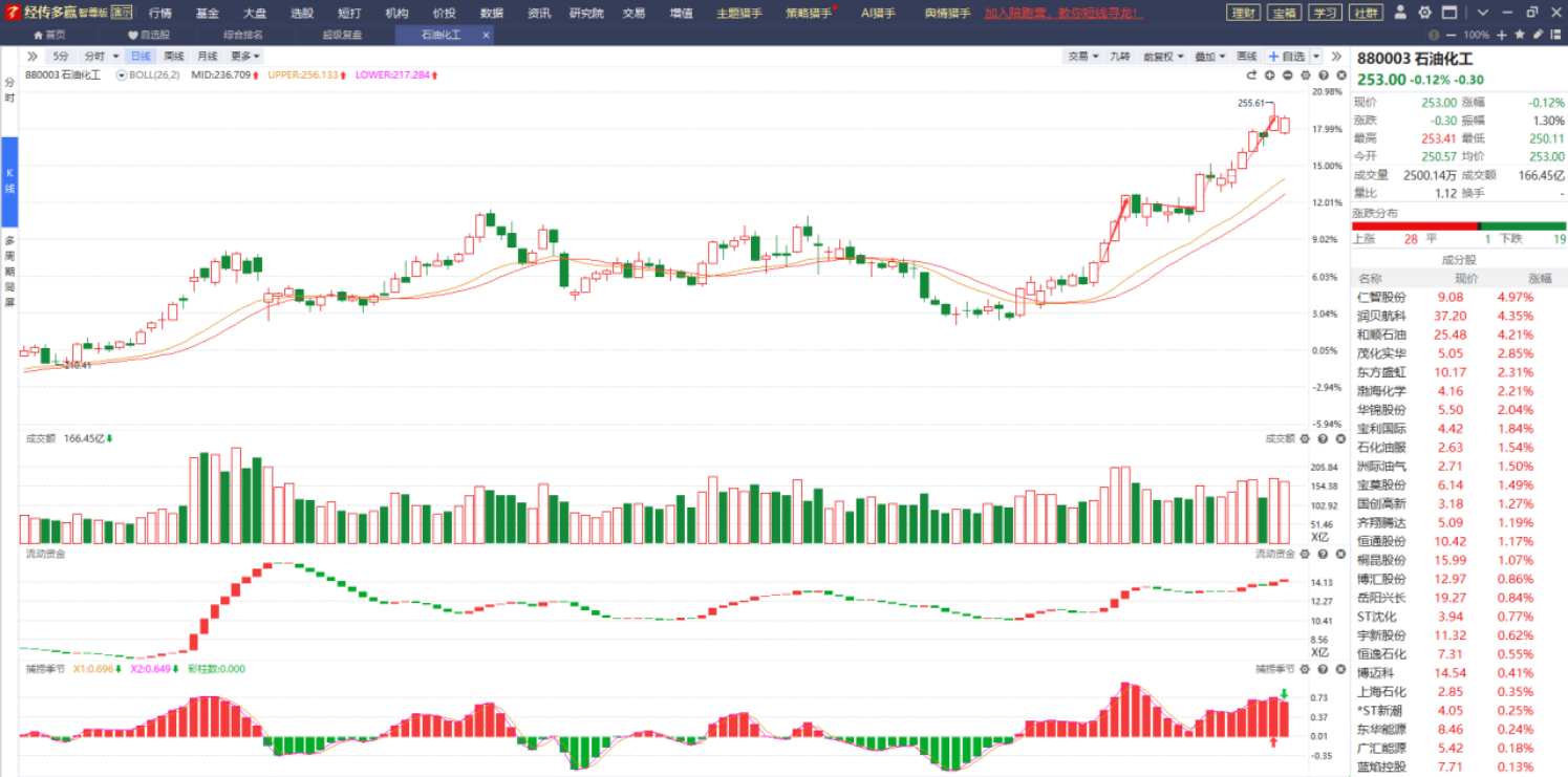 在指数震荡的这段时间石油化工的表现很好,首先趋势方面肯定是没有问题的,其次就是成交量受昨天行情的影响有小幅萎缩,流动资金连续两天翻红,但捕捞季节收出死叉,有人可能会觉得石油板块的走势太慢了,但是回过头看看银行的走势就会发现,有些板块尤其是惰性比较强的板块不能只看短期的走势,要拉长时间来看,一旦周期长了发现它的涨幅其实也不弱,石油板块同样是这个道理,可以在调整时积极介入。