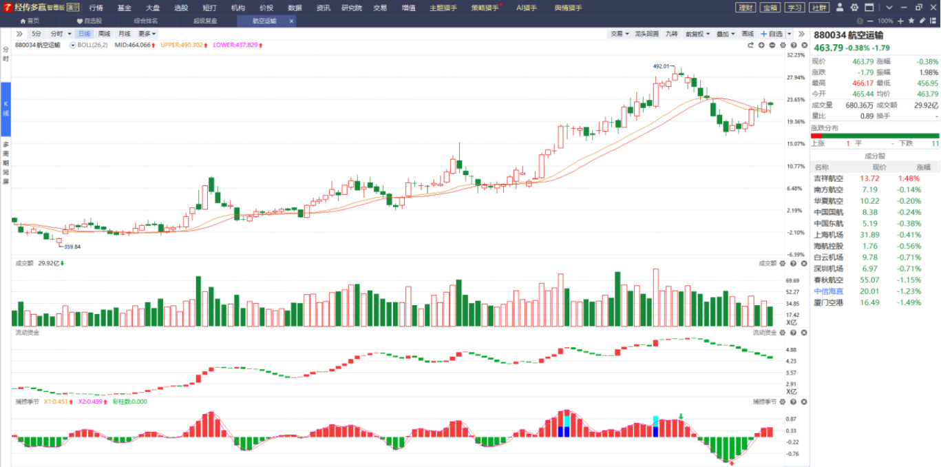 就目前而言该板块处于调整阶段,长期具备盈利修复弹性,而且燃油附加费的上调(12月5日起800公里以上航段涨至40元)也会在一定程度上刺激该板块,它目前站在智能辅助线上方,捕捞季节收出金叉,指标跟趋势慢慢呈现出弱转强的趋势,只要不跌破辅助线的支撑以及更好好转信号出现都可以持续关注。