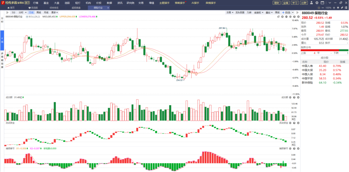 保险板块在智能辅助线下方震荡下跌,昨天在市场情绪比较悲观的影响下,它尾盘展开了反弹行情,从目前走势跟指标而言它并没有企稳的迹象,布局该方向主要是为了应对指数的持续下跌,在指数下跌的时候偏防守的方向一般都会迎来不错的反弹行情,最核心目的就是为了避险。