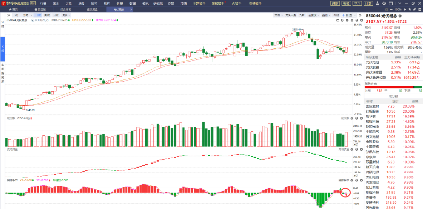 光伏有点在底部止跌迹象,目前正处于突破智能辅助线的关键阶段,捕捞季节收出金叉,成交量呈放量状态,指标有所好转,耐心等待更多好转信号的出现。