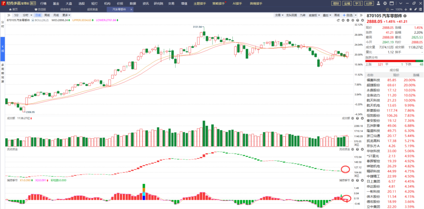 汽车零部件在连续调整三天之后止住了跌势并站在智能辅助线上方,成交量呈持续放量状态,流动资金连续翻红,捕捞季节收出金叉,趋势跟指标都处在弱转强的初期,耐心关注其反弹上涨行情。