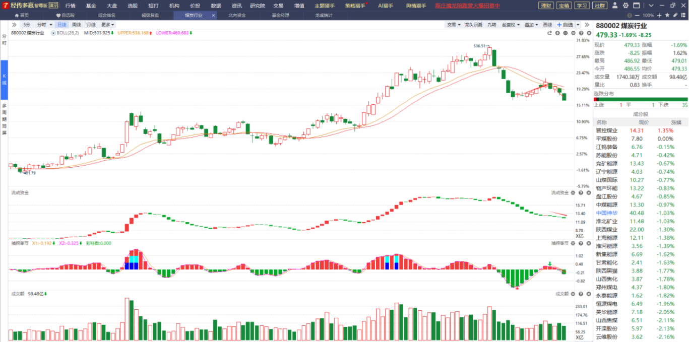 煤炭行业突破智能辅助线压制失败,被打压下来,主要是因为近期市场稍有回暖,所以导致这些周期股集体进入调整区域,但不代表它们就没有机会,一旦市场无法维持高涨的上涨行情,那么它们又会有新的反弹行情。