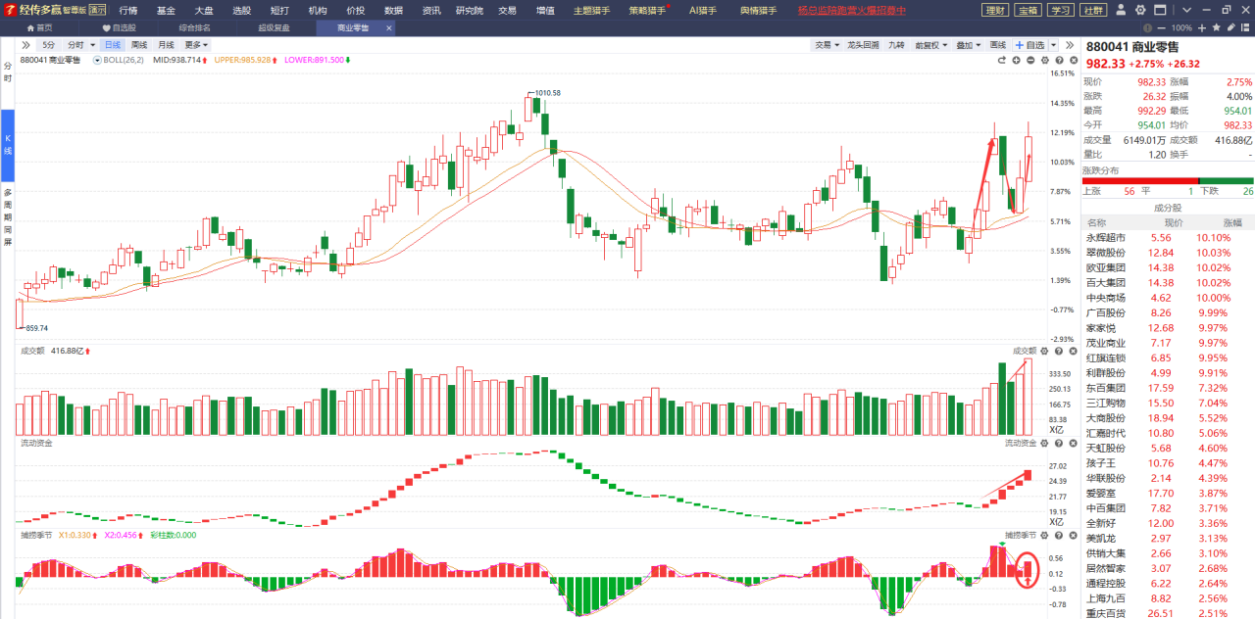 商业零售板块在市场震荡时走出逆市上涨走势,目前各项指标都表现优异,流动资金持续翻红,捕捞季节收出金叉,成交量呈逐渐放量状态,整体处于回档金叉初期状态,指标跟趋势方面没有问题,而且提振内需一直是国家重点提及的方向,后期上涨空间很大,但由于市场环境不稳定,切勿追高,可以在调整时介入。